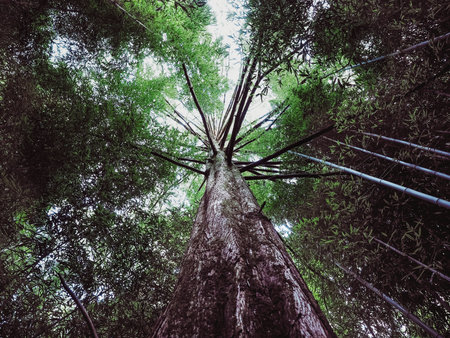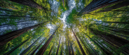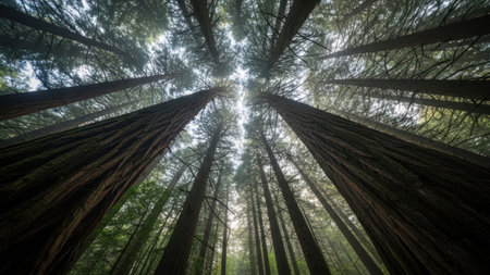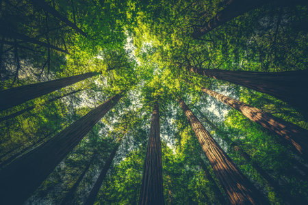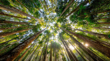 An upward perspective captures towering tree trunks reaching towards the sky. The forest environment showcases vertical lines, natural light, and the texture of bark. This wide-angle view reveals a lush canopy, creating a sense of depth and perspective within the outdoor setting.