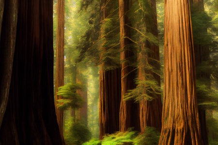 A towering redwood forest in Northern California, where ancient colossal trees stretch toward the sky, their rich red bark bathed in dappled sunlight, with a misty forest floor covered in ferns and fallen leaves