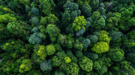 Stunning aerial perspective of vibrant treelines in a natural forest. The image captures the diverse shades of green foliage and dense vegetation canopy, promoting ecological beauty.
