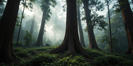 Immerse yourself in the serenity of a foggy forest, showcasing majestic redwood trees reaching toward the sky. This peaceful grove invites nature lovers to experience tranquility and beauty.