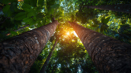An upward perspective captures tall trees within a dense forest. Warm sunlight streams through the green canopy, illuminating the scene. The image showcases textures, shadows, and natural color variations. Suitable for environmental themes, editorial content, and various design projects.