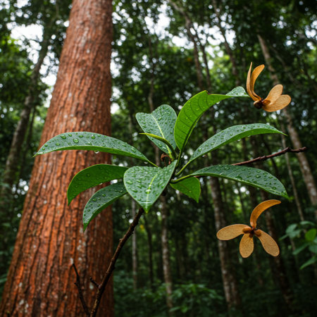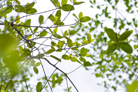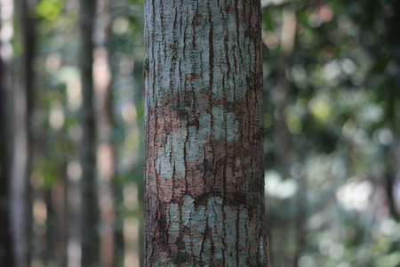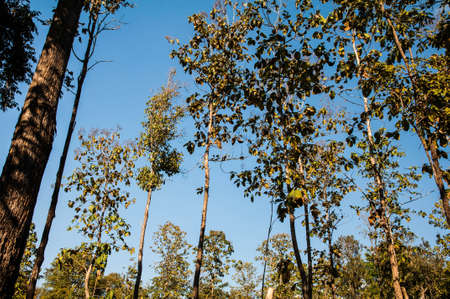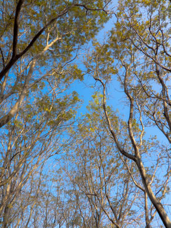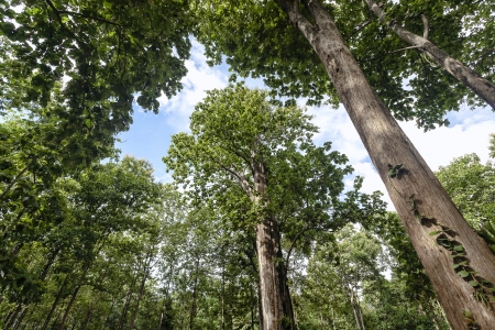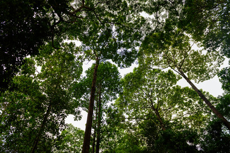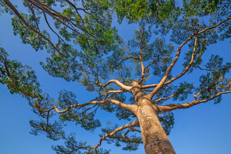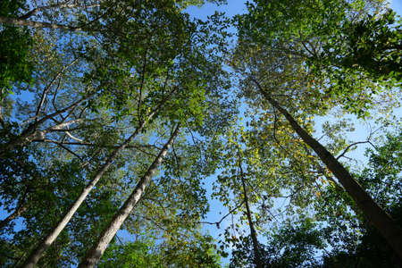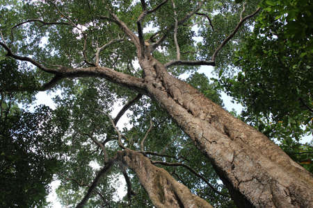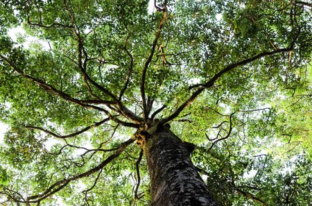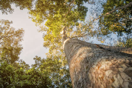 A low angle view from the base of a tree looking at the clump of green leaves atop the huge Dipterocarpus alatus Roxb in a forest park in the Thai countryside.