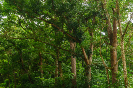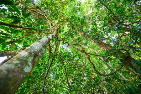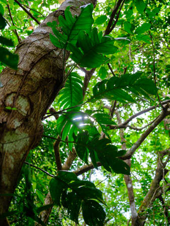 Summer landscape on tropical koh Kood island in Thailand. Giant old trees Makayuk taken during jungle trekking.