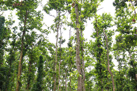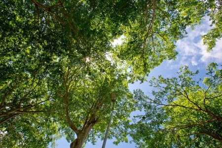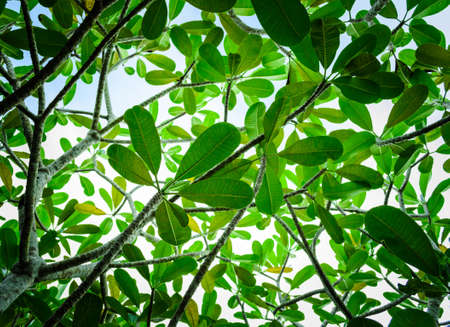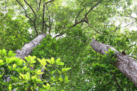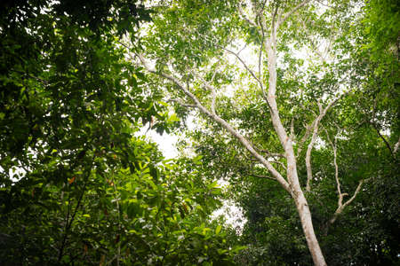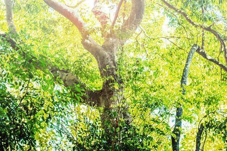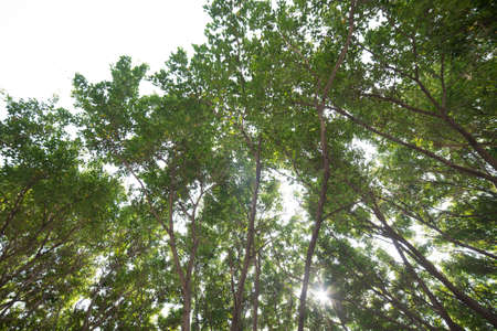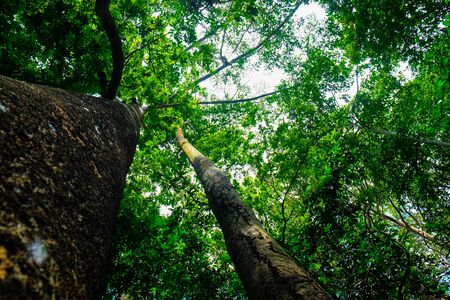 Under the big tree, Bottom view of the treetops of trees in forest show detail or pattern of green leaves in Thailand, Ant eye view with nature forest wood.