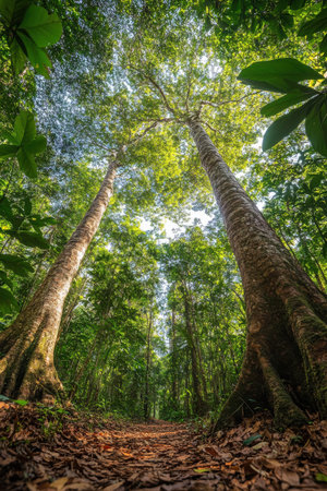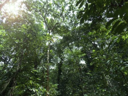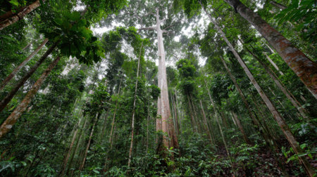 Lush green tropical rainforest with tall straight trees and dense canopy seen from forest floor