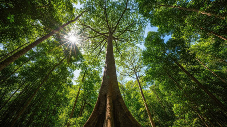 Sunlight filters through the vibrant green canopy as the imposing trunk of a towering tree stretches towards the heavens, creating a breathtaking view of nature's grandeur