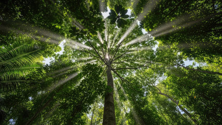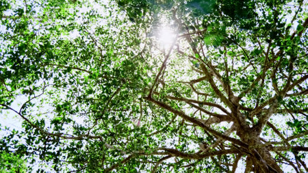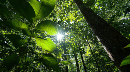 Sunlight streams through a dense canopy of green leaves, creating a serene and vibrant forest atmosphere.