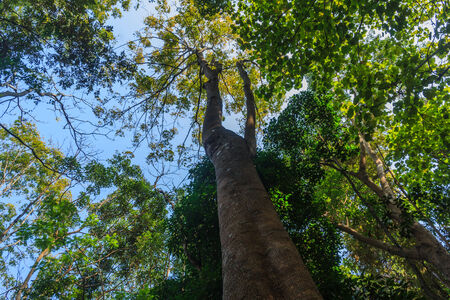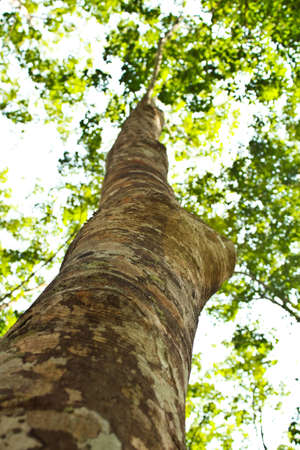 Looking up the trunk of a giant rainforest tree to the canopy, Thailand.