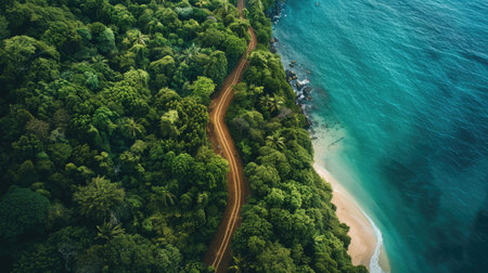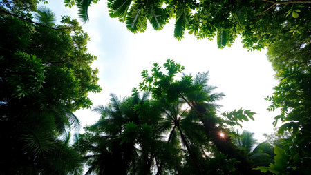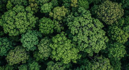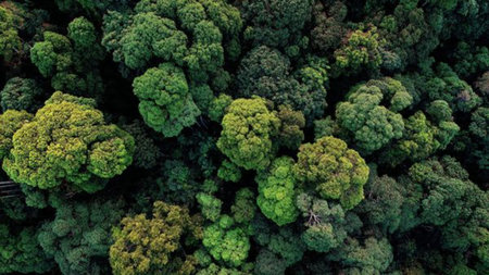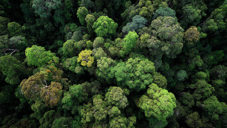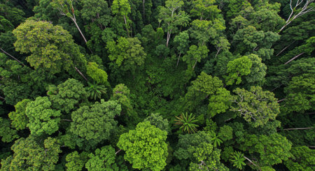 Aerial view of a dense, vibrant green forest canopy, showcasing lush tropical trees from above. Perfect for nature, environment, or conservation th...
