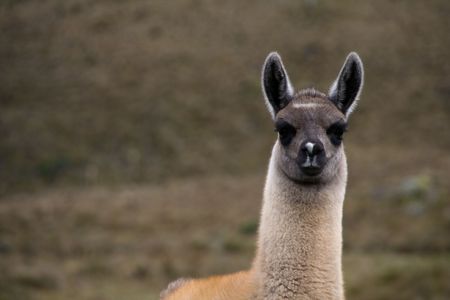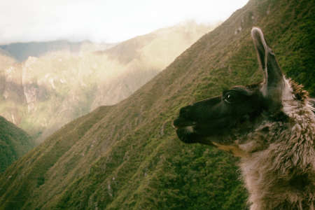 Portrait of a brown lama on the Choqueqirao Trek to Machu Picchu in the Andes Mountains, Peru