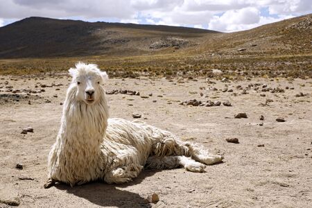 Llama (Lama glama) Resting on the Ground, Looking into the Camera. Highlands of Peru.