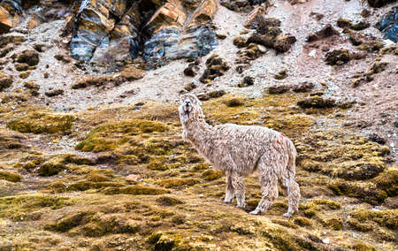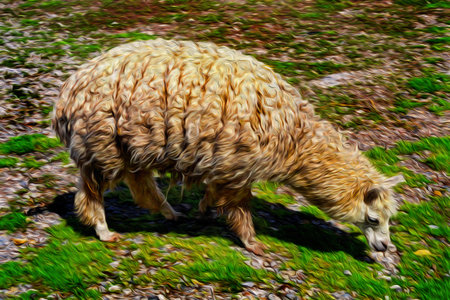Wool-covered llama grazing on green pasture in the Andean highlands of Peru. The highest region with the largest mountain range in the Americas. Oil paint filter.