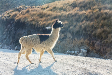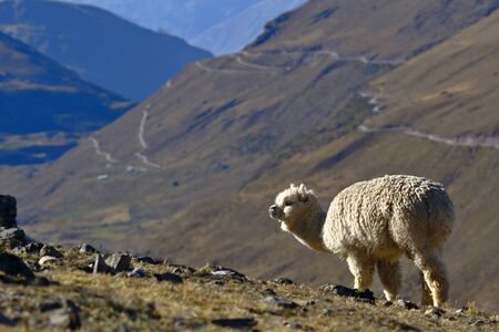 Lonely Alpaca (vicugna pacos) recorded at dawn on the slopes of a hill while feeding.