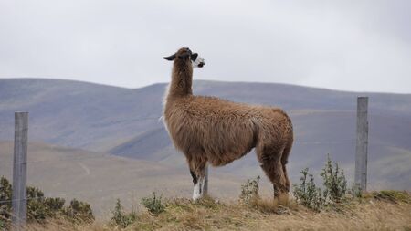 Brown llama on the boundless Ecuadorian field.