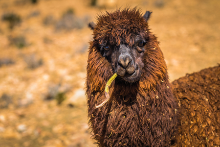 Funny Alpaca, Lama pacos, near the Vinicunca mountain, famous destination in Andes, Peru