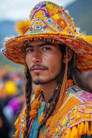 Vivid and colorful traditional Andean dance costumes, with intricate designs and accessories