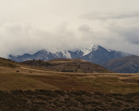 View of the Andes mountains near Moray ruins, in the Sacred Valley of the Incas, Maras. Peru. South America.
