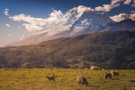 Flock of Sheeps and Huascaran in Cordillera Blanca at sunrise, snowcapped Andes