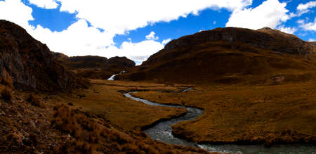 High altitude flowing stream in harsh barren landscape with scenic dramatic sky. Wide angle view from above at 4000 m on the Andean highlands, Peru.