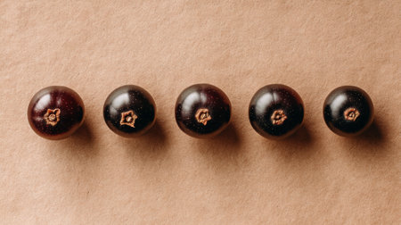 A stunning image of dark spherical fruits arranged in a row on a textured brown background, perfect for themes of nature, health, and organic beauty in food photography.