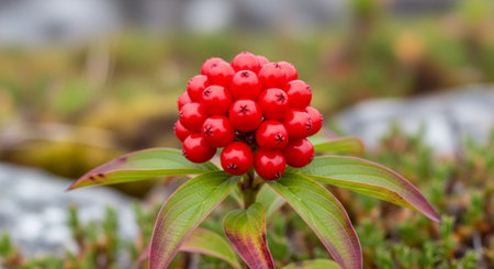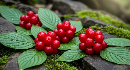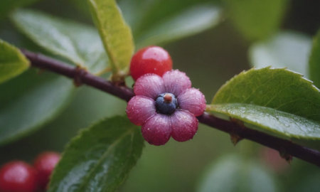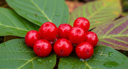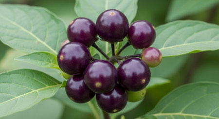 Macro shot of ashwagandha berries and leaves with dew drops in lush nature setting