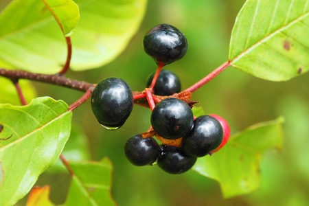 Black poisonous berries grow on a tree, nature landscape.