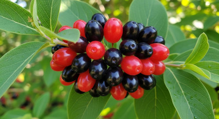 Red and black berries on a branch with green leaves in the garden