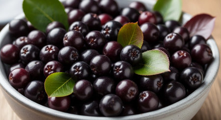 A bowl of glossy dark purple berries with green leaf on pastel pink background casting soft shadow, minimal food still life composition