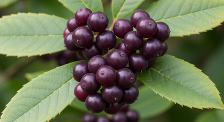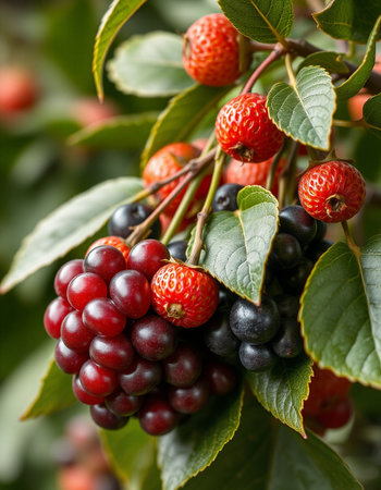 Clusters of ripening berries on vibrant green foliage in a natural setting during late summer afternoon