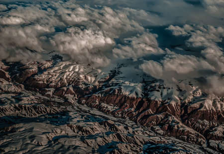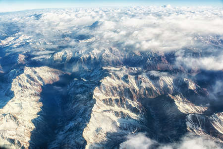 Aerial view from the plane of hills snow and mountains landscape with shadows of sunlight and clouds covered beautifully. Above the clouds, Snow capped mountain, No focus, specifically.