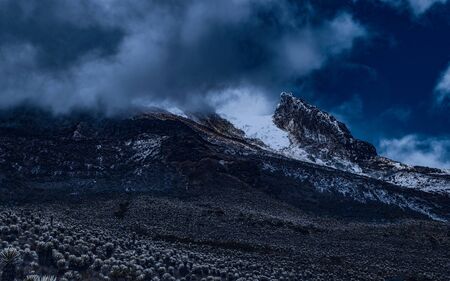 Long exposure night shots in the moorland located on the slopes of the beautiful snowy peak of Tolima Colombia, which shows a significant decrease in glacial masses that makes us reflect on the climate change we are currently experiencing.