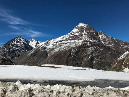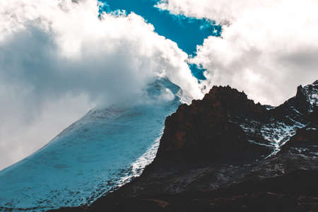Clouds embracing a mountain peak over highway of Zojila Pass, a high mountain pass between Srinagar and Leh at 11575 ft, 9 Km stretch. Highest Indian National Highway.