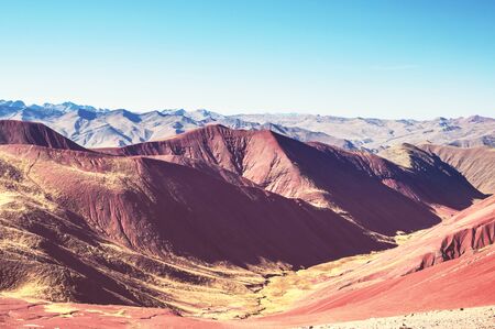 Hiking scene in Vinicunca, Cusco Region, Peru. Montana de Siete Colores, Rainbow Mountain.