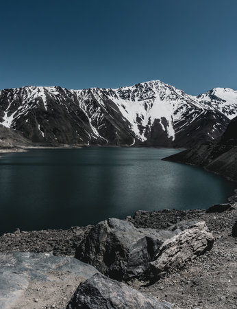 Landscape of mountain snow and lagoon in Santiago, Chile