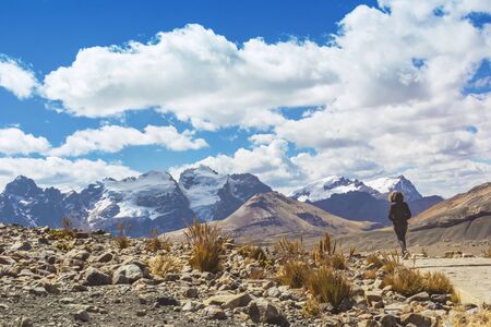 Woman walking on the Andean mountain range trail to the Pastoruri glacier, in the Huascarán National Park, Huaraz / Peru. Tropical glacier at 5200 meters above sea level.