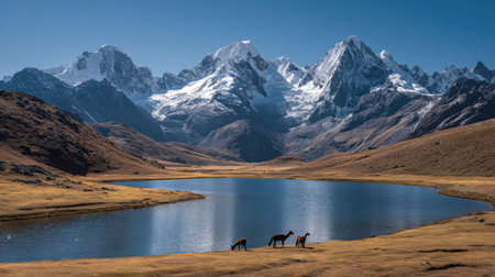 A stunning alpine scene features majestic mountains in the background, a serene lake, and horses grazing peacefully under a clear blue sky.