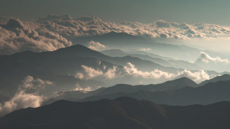 Experience the beauty of majestic mountains adorned with layers of mist and fog. A tranquil scene that captures the essence of nature's serene landscapes.