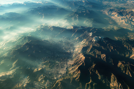 A breathtaking view captures a sprawling city nestled among majestic mountains, with the warm hues of sunset casting a glow over the hazy terrain, revealing pathways and structures.