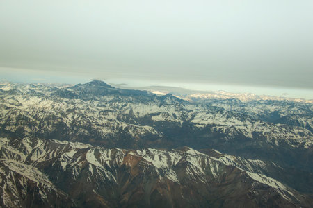 Andes Mountains (Cordillera de los Andes) viewed from an airplane window, near Santiago, Chile.