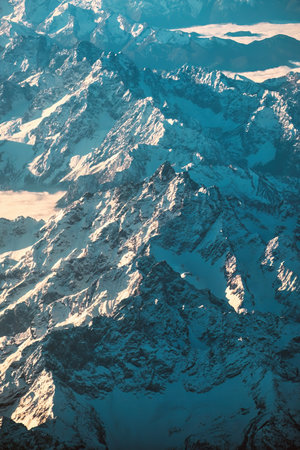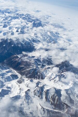 above view of snowy tops of mountains through window of flying airplane on sunny autumn day