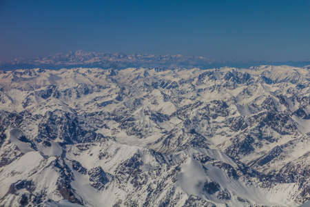 Aerial view of snow covered Tian Shan mountains in Kyrgyzstan