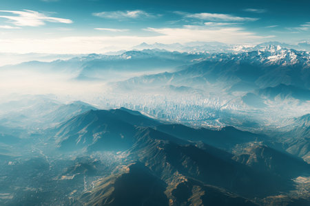 Majestic mountains frame a sprawling city enveloped in mist, while distant snow-capped peaks rise under a clear sky during the early morning light, creating a breathtaking vista.