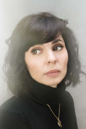 A Russian woman stands gracefully with long, flowing hair and striking grey eyes. Soft light enhances her natural beauty, creating an intimate atmosphere. Serious woman 40-50 years old. Generative AI.
