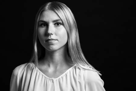 Young woman or pretty girl with adorable face, on black background. Natural beauty