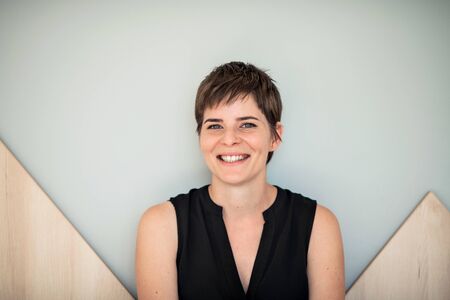 A close-up portrait of a young woman with short blonde hair, wearing a stylish coat, looking directly at the camera with a neutral expression, soft lighting, minimalistic background