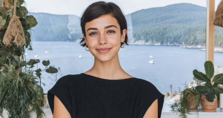 A woman smiles as she stands in a bright room. She looks out towards the water with boats and mountains in the background. Green plants decorate the room around her.