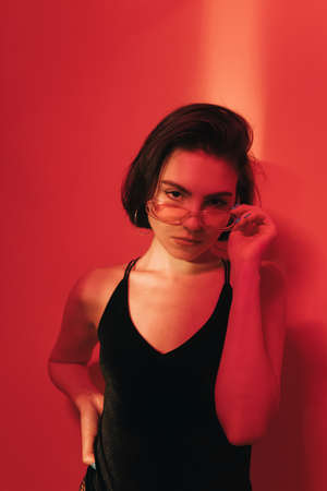 serious young woman with bob haircut in black bodysuit adjusting sunglasses and looking at camera on red background with shadows