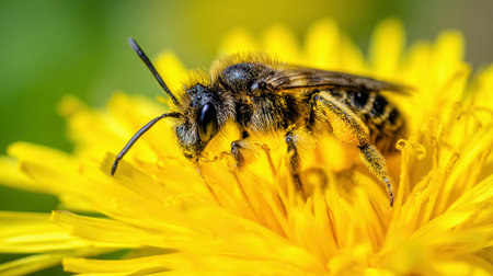 close up of bee collecting honey on a yellow flower dandelion against soft defocused green background. Copy space. bee busy picking up pollen from dandelion