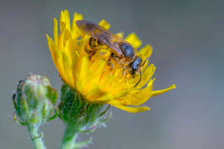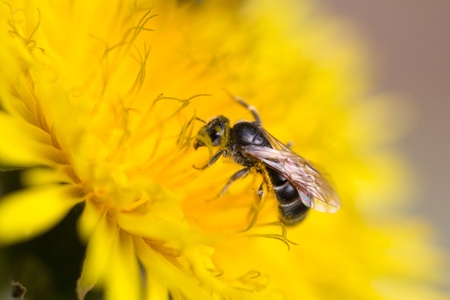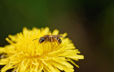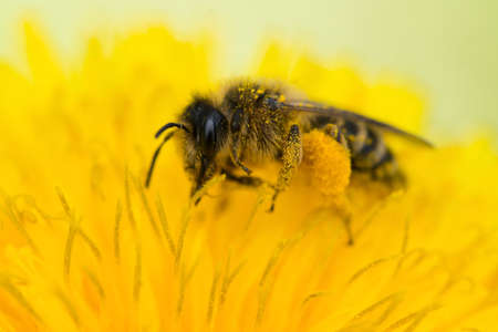 A bee collects pollen and drinks nectar on a yellow dandelion flower