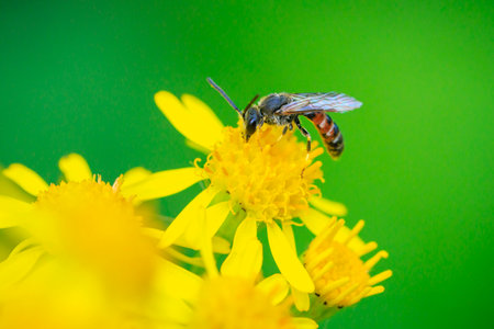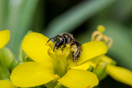 Closeup of a lasioglossum calceatum, a Palearctic species of sweat bee, pollinating on a yellow flower.